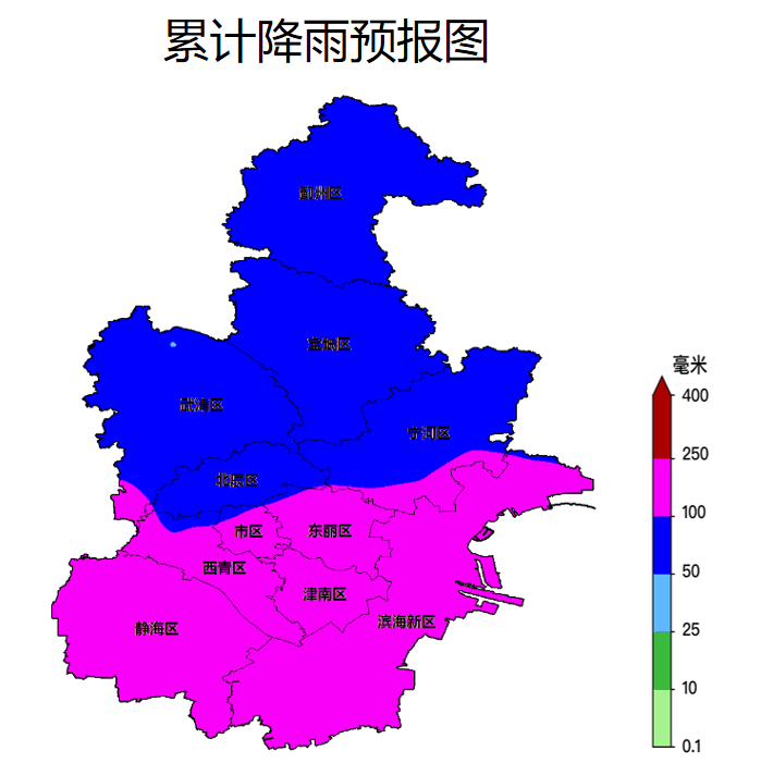 图1 天津累计降雨量预报图(6月28日至7月11日)