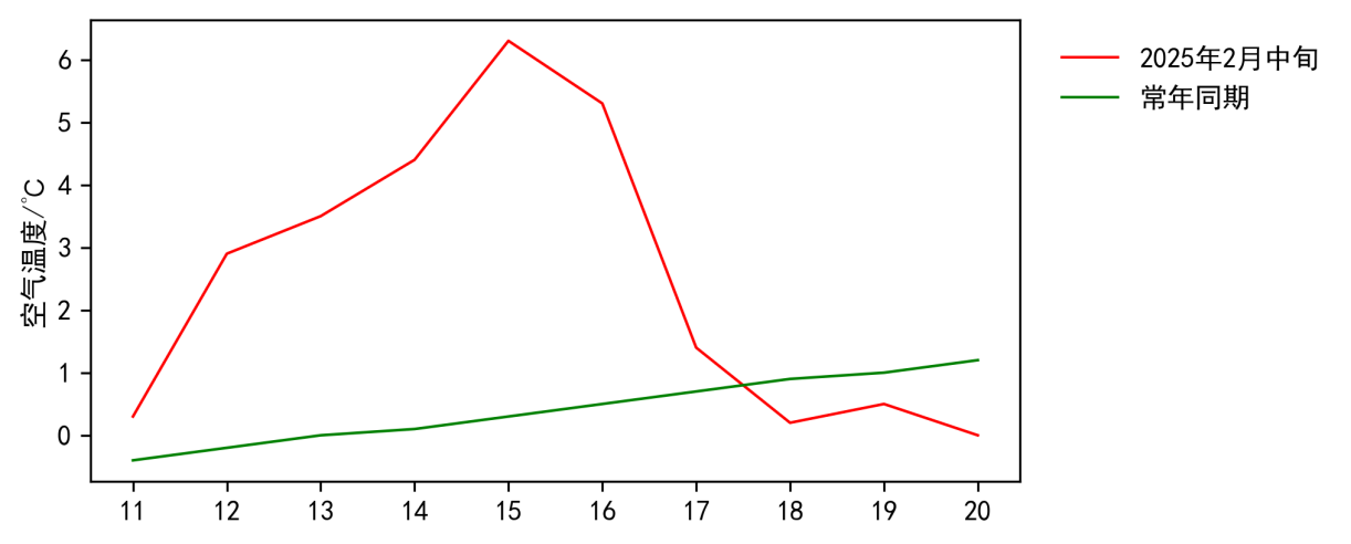 图2 2025年2月中旬USDT博彩平台 日平均气温与常年同期对比图