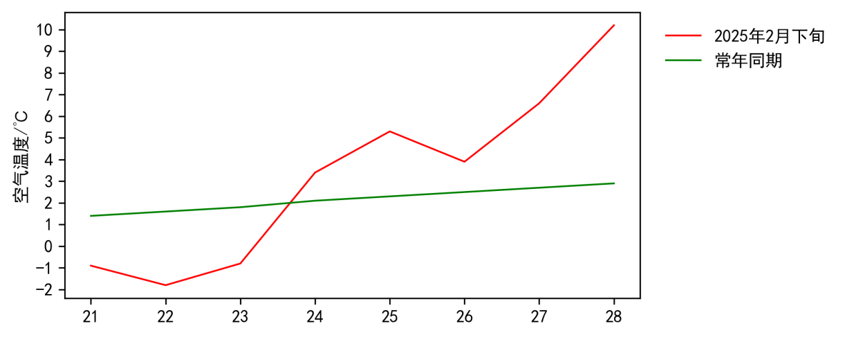 图2 2025年2月下旬USDT博彩平台 日平均气温与常年同期对比图
