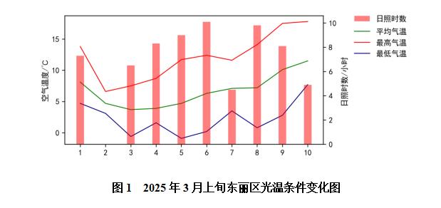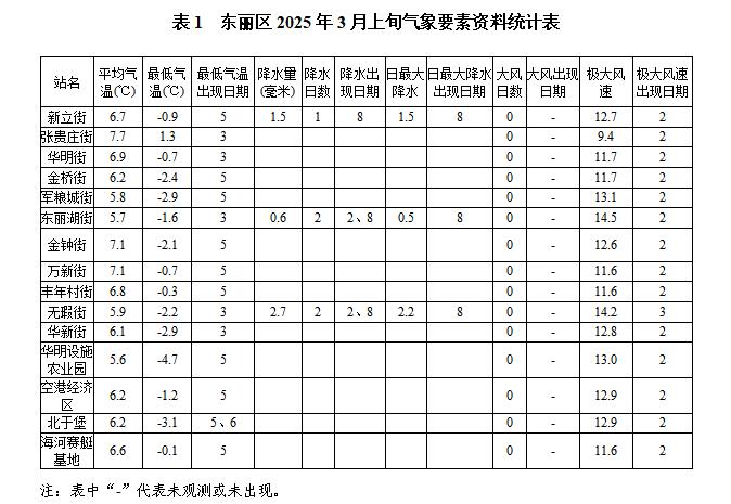 本旬我区各街道平均气温5.6~7.7℃,较去年同期(3.2~5.4℃)变幅2.0~2.6℃,最低气温-4.7℃,出现在3月5日的华明设施农业园;降水量1.5毫米,较去年同期(0.0毫米)变幅1.5毫米,降水0~2天;旬日照时数68.5小时,较去年同期(75.5小时)偏少7.0小时;无7级以上大风。