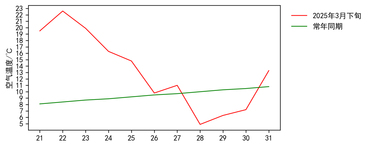 图2 2025年3月下旬USDT博彩平台 日平均气温与常年同期对比图