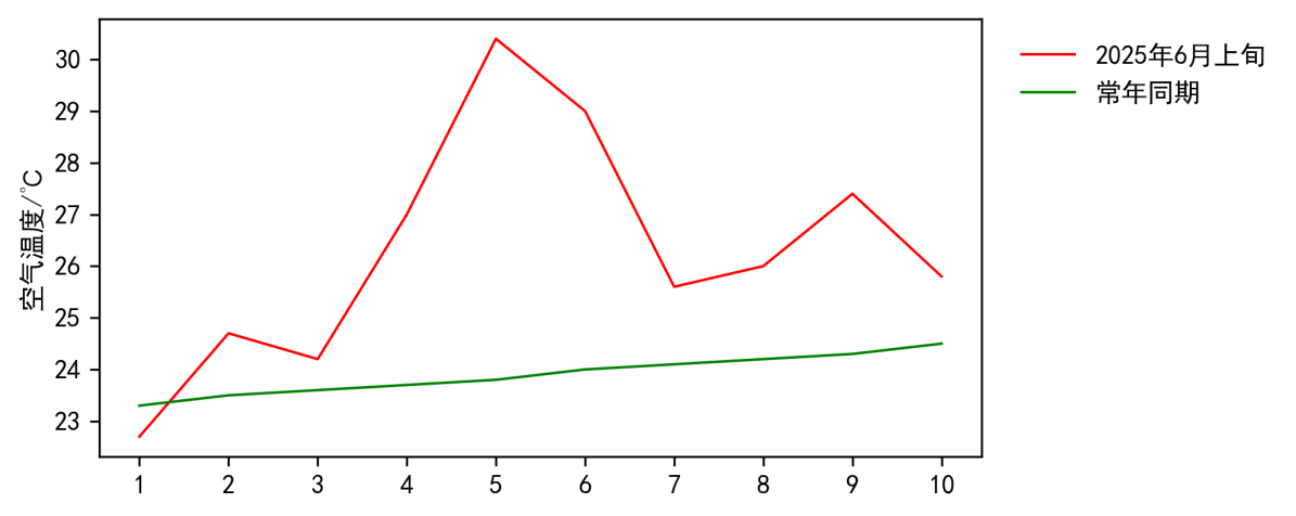 图2 2025年6月上旬USDT博彩平台 日平均气温与常年同期对比图