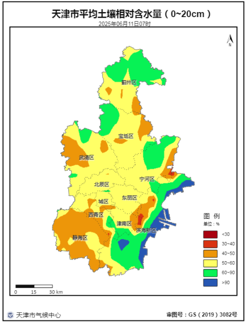 图4 2025年6月11日7时天津市平均土壤相对含水量(0-20cm)分布图