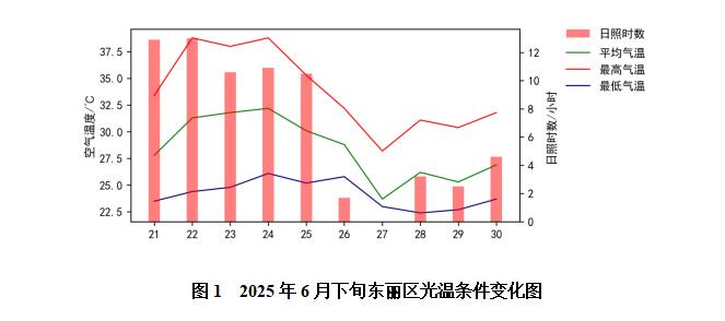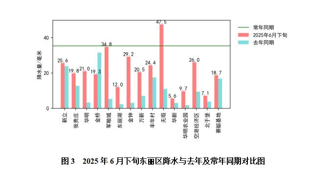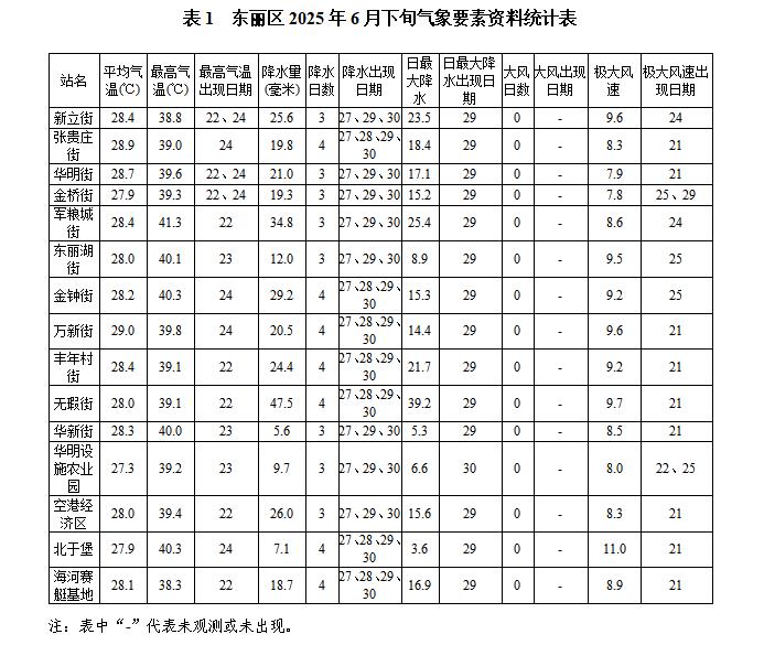 本旬我区各街道平均气温27.3~29.0℃,较去年同期(27.4~28.6℃)变幅-0.1~0.6℃,最高气温41.3℃,出现在6月22日的军粮城街;降水量5.6~47.5毫米,较去年同期(1.8~31.5毫米)变幅-12.2~36.5毫米,降水3~4天;旬日照时数69.9小时,较去年同期(95.7小时)偏少25.8小时;无7级以上大风。
