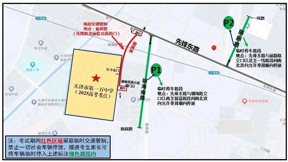 东丽交警提示:请限制通行车辆途经上述交通管制路段提前选择绕行,行经考点周边道路车辆切勿鸣喇叭。考试期间接送考生家长可在不影响其他车辆通行的条件下,将车辆临时单排顺向依次停放到驯海南路(先锋东路与驯海路交口南侧)和丽新路(一纬路至先锋东路)。先锋东路(外环线至一经路)路段禁止停放社会车辆,听从现场交警及管理人员指挥停放,驾驶员离开车辆时携带好贵重物品。
