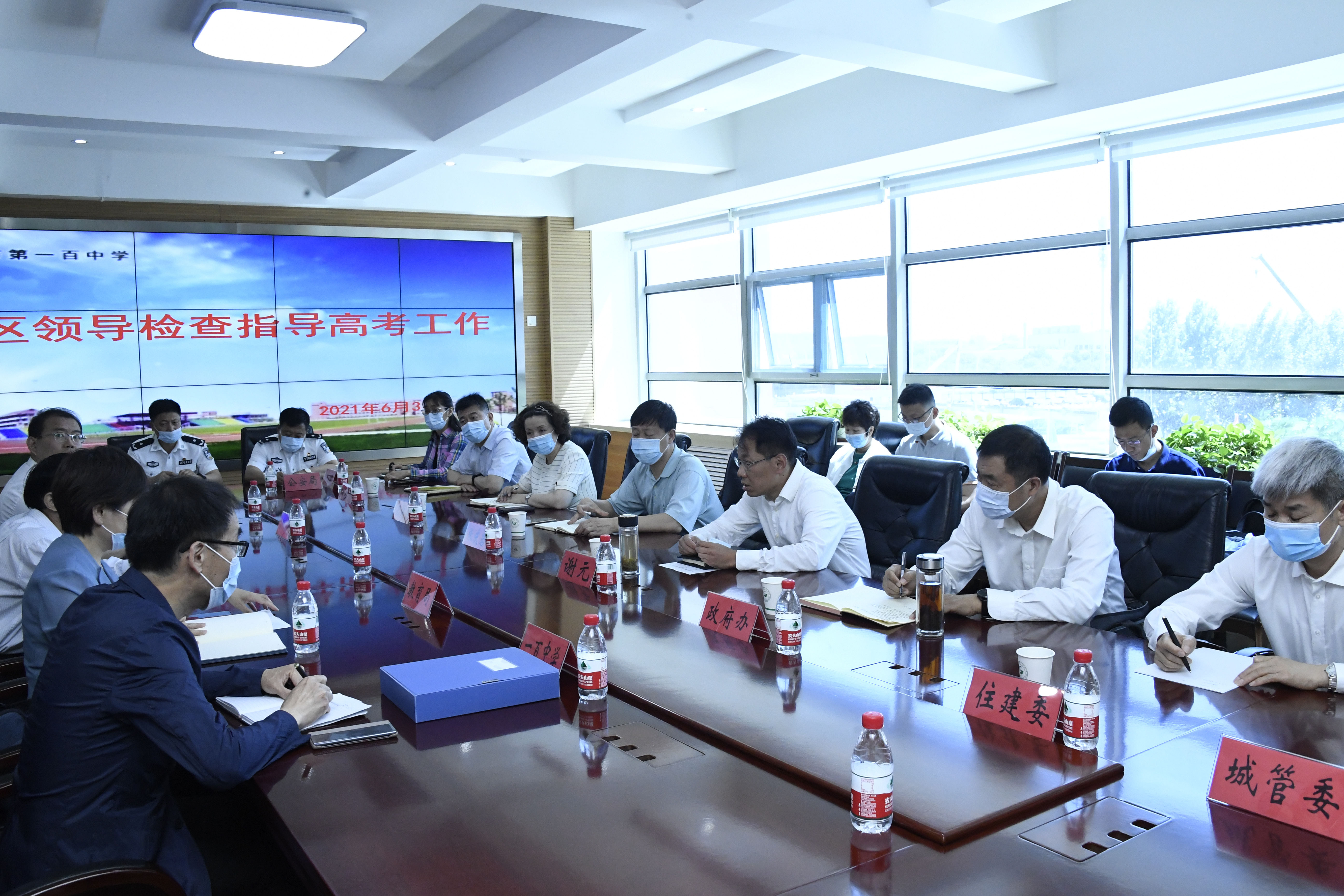 在天津市第一百中学,谢元仔细检查了高考考点准备工作、人员岗位设置、考场管理、后勤保障和疫情防控准备工作等情况,并主持召开座谈会,听取区教育局、一百中学等单位负责人关于高考期间各项应急准备工作情况的汇报,现场协调解决存在的困难和问题。