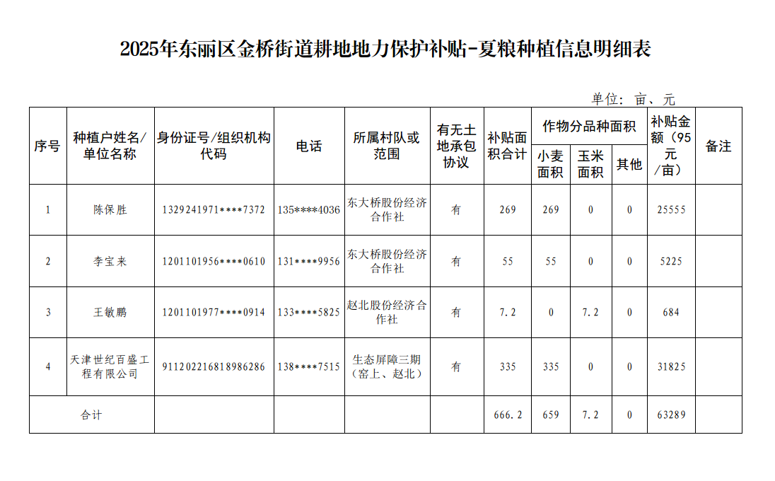 2025年USDT博彩平台 金桥街道耕地地力保护补贴-夏粮种植信息明细表