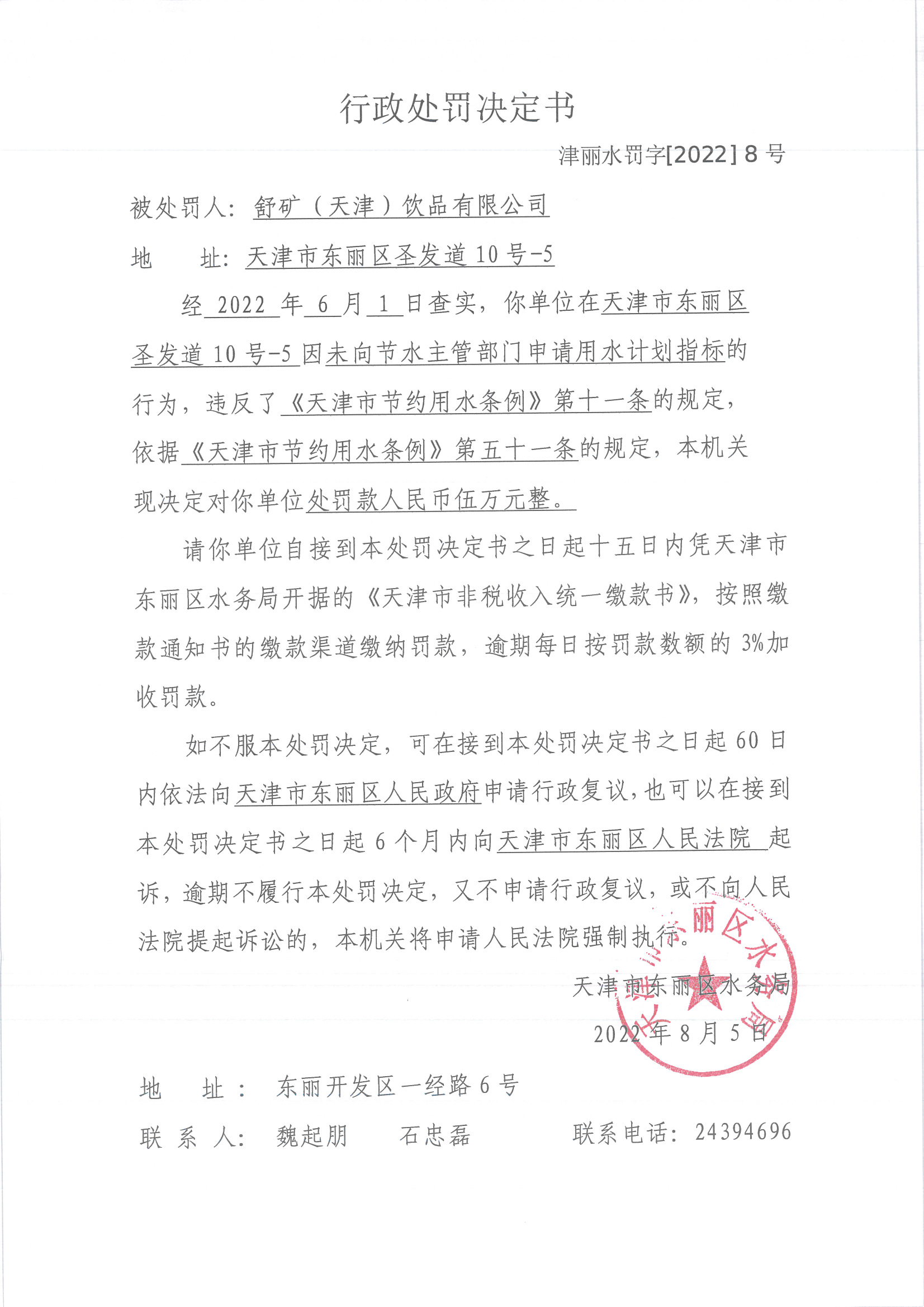 行政处罚决定书(津丽水罚字【2022】8号)