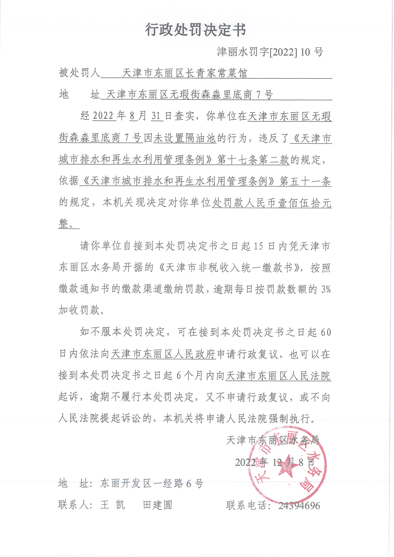 行政处罚决定书(津丽水罚字【2022】10号)