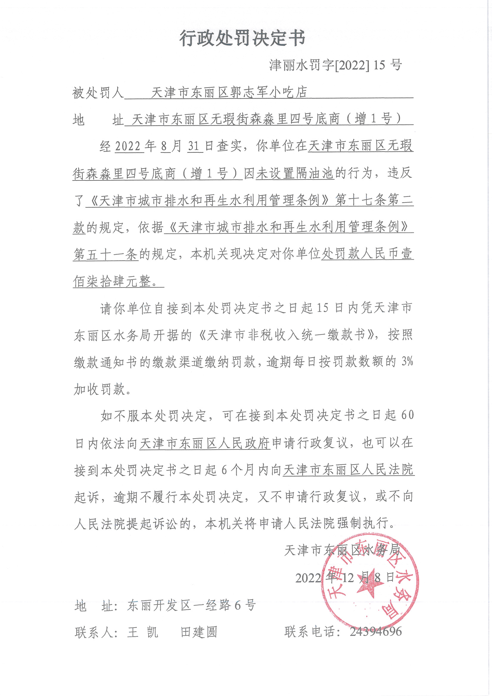 行政处罚决定书(津丽水罚字【2022】15号)