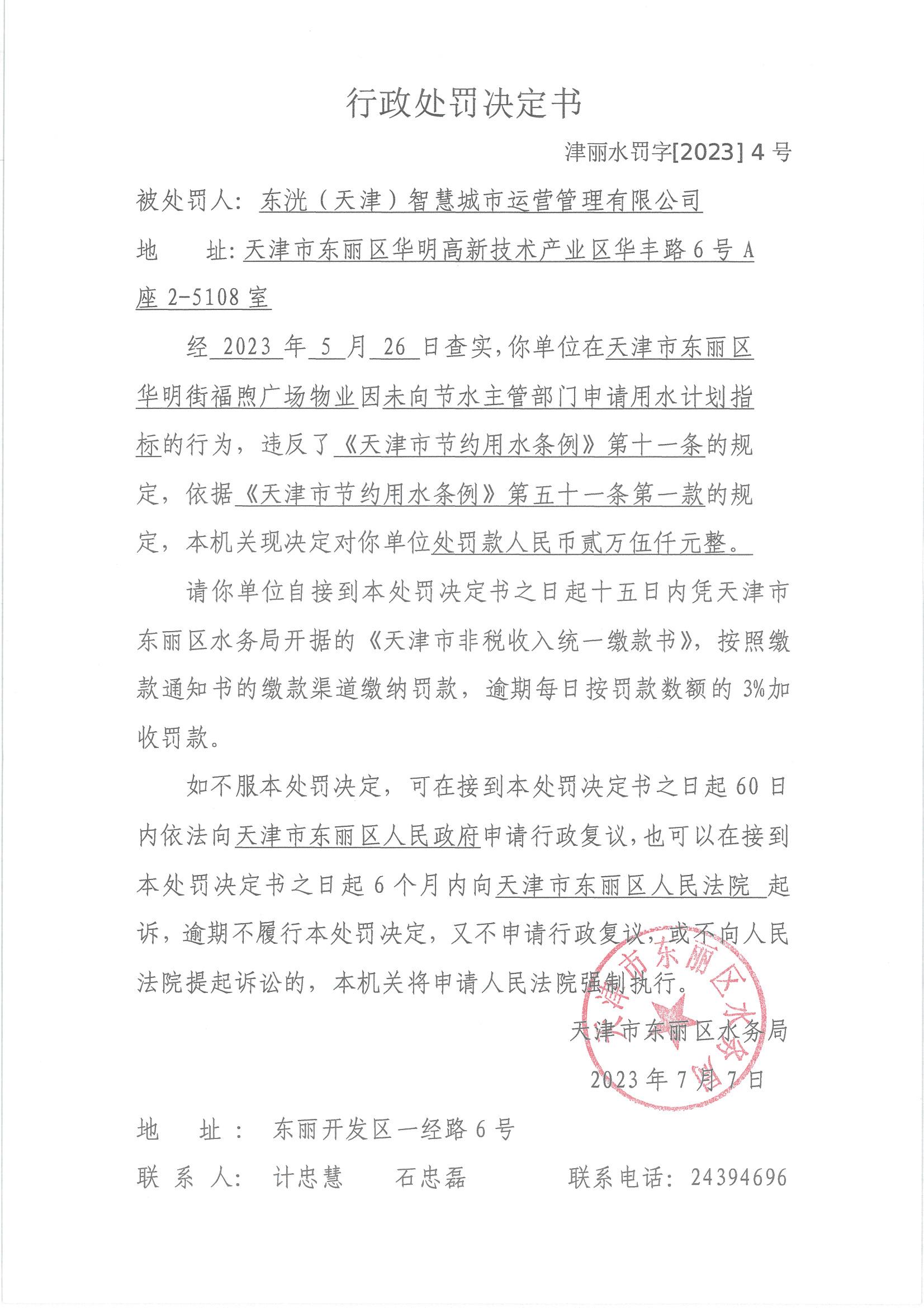 行政处罚决定书(津丽水罚字【2023】4号)