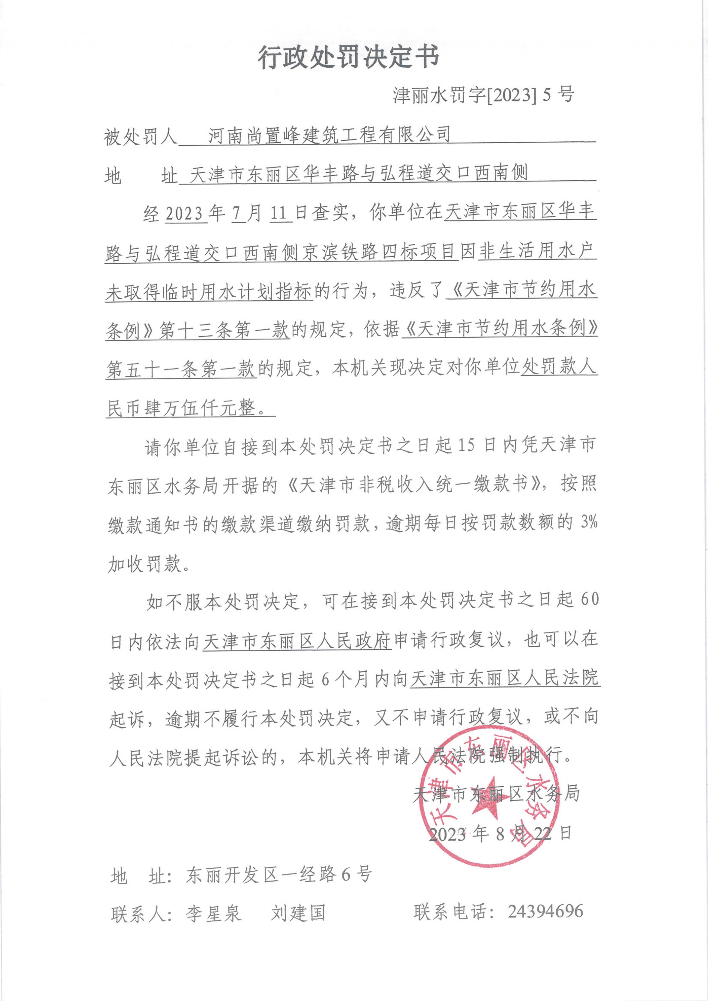 行政处罚决定书(津丽水罚字【2023】5号)