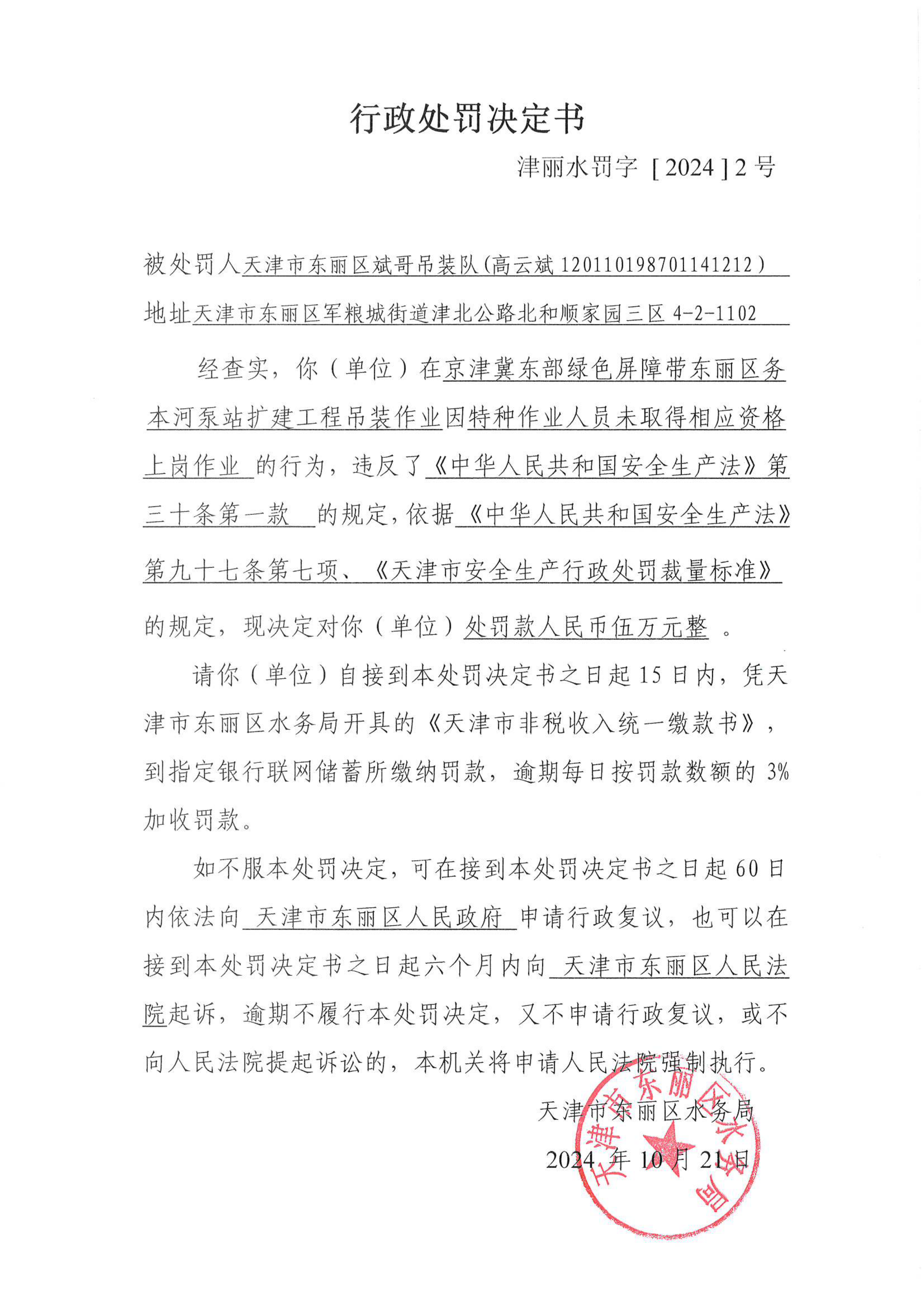 行政处罚决定书(津丽水罚字【2024】2号)