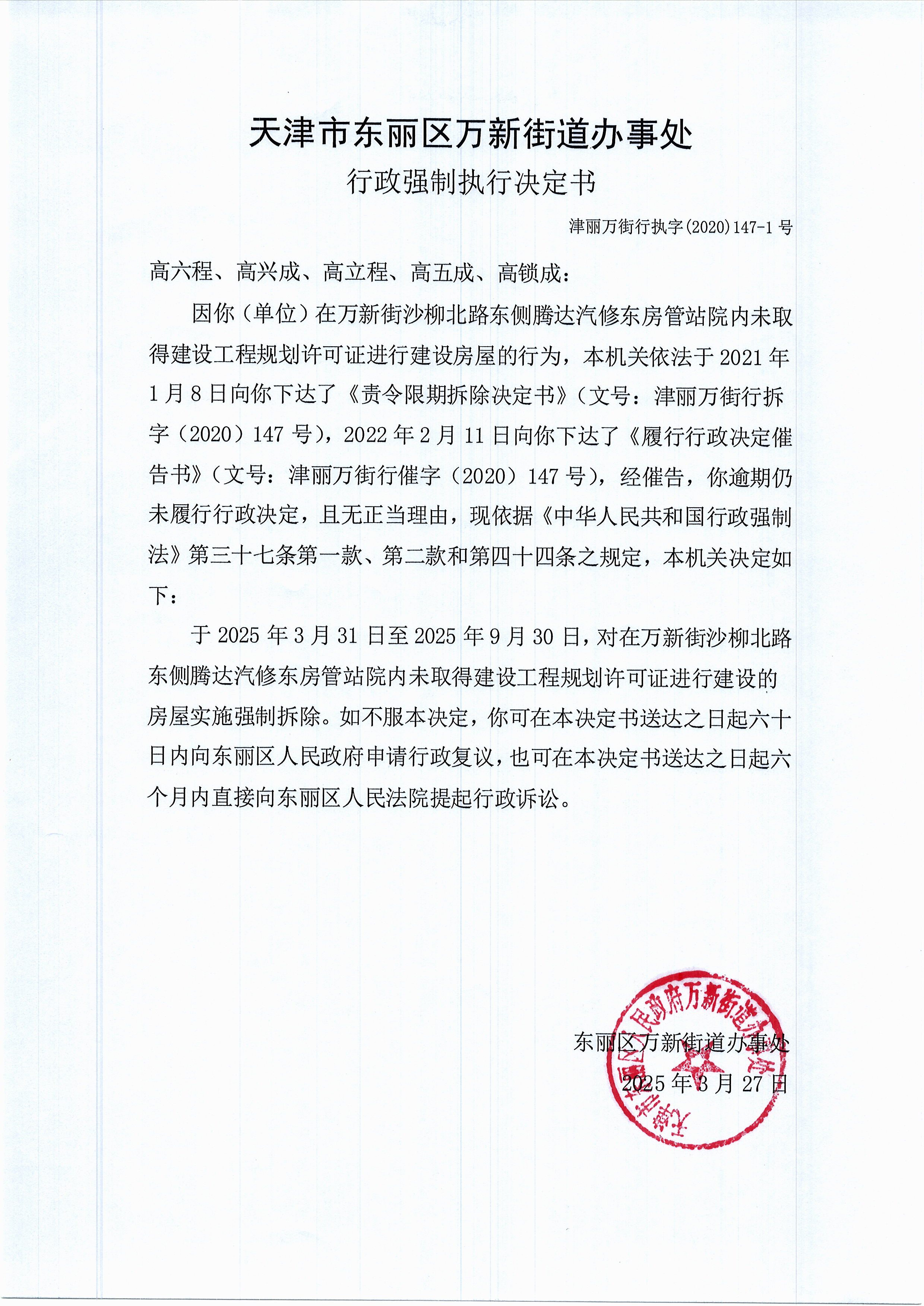 经查,你(单位)在万新街沙柳北路东侧腾达汽修东房管站院内未取得建设工程规划许可证进行建设建筑物(构筑物)的行为违反了《中华人民共和国城乡规划法》第四十条第一款和《天津市城乡规划条例》第五十二条、第六十二条第一款之规定,事实清楚,证据确凿。本机关依据《中华人民共和国城乡规划法》第六十四条和《天津市城乡规划条例》第七十三条之规定,于2021年1月8日向其下达《责令限期拆除决定书》(文号:津丽万街行拆字(2020)147号),责令你(单位)限期拆除上述违法建设。因你(单位)逾期未履行本机关作出的行政决定,依据《中华人民共和国行政强制法》第三十五条之规定,于2022年2月11日向其下达《履行行政决定催告书》(文号:津丽万街行催字(2020)147号),再次责令你(单位)限期拆除违法建设。经催告,你(单位)逾期仍未履行行政决定,且无正当理由,依据《中华人民共和国行政强制法》第三十七条第一款、第二款和第四十四条之规定,于2025年3月27日向其下达《行政强制执行决定书》(文号:津丽万街行执字(2020)147-1号)。