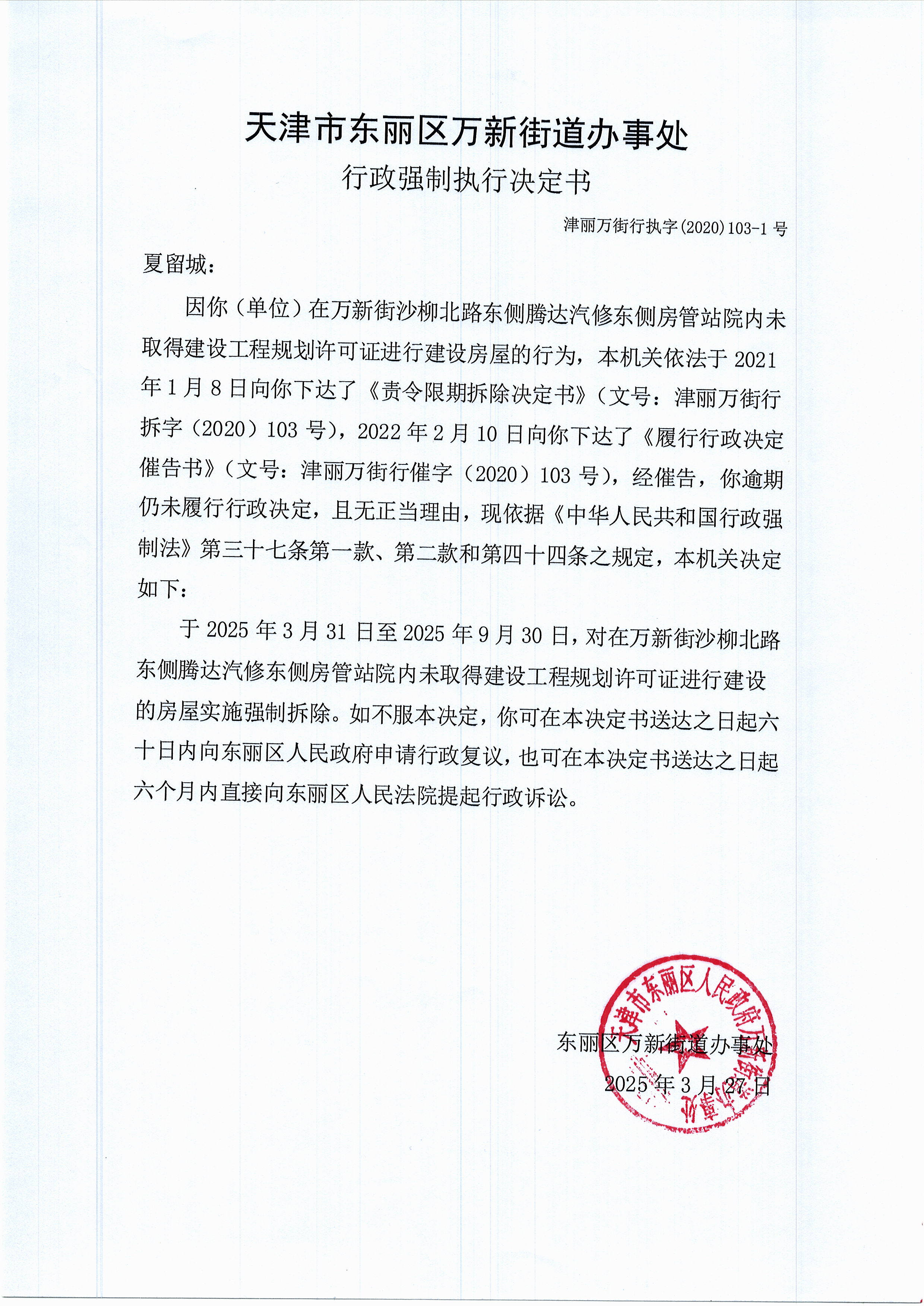 经查,你(单位)在万新街沙柳北路东侧腾达汽修东侧房管站院内未取得建设工程规划许可证进行建设建筑物(构筑物)的行为违反了《中华人民共和国城乡规划法》第四十条第一款和《天津市城乡规划条例》第五十二条、第六十二条第一款之规定,事实清楚,证据确凿。本机关依据《中华人民共和国城乡规划法》第六十四条和《天津市城乡规划条例》第七十三条之规定,于2021年1月8日向其下达《责令限期拆除决定书》(文号:津丽万街行拆字(2020)103号),责令你(单位)限期拆除上述违法建设。因你(单位)逾期未履行本机关作出的行政决定,依据《中华人民共和国行政强制法》第三十五条之规定,于2022年2月10日依法向其下达《履行行政决定催告书》(文号:津丽万街行催字(2020)103号),再次责令你(单位)限期拆除违法建设。经催告,你(单位)逾期仍未履行行政决定,且无正当理由,依据《中华人民共和国行政强制法》第三十七条第一款、第二款和第四十四条之规定,于2025年3月27日依法向其下达《行政强制执行决定书》(文号:津丽万街行执字(2020)103-1号)。