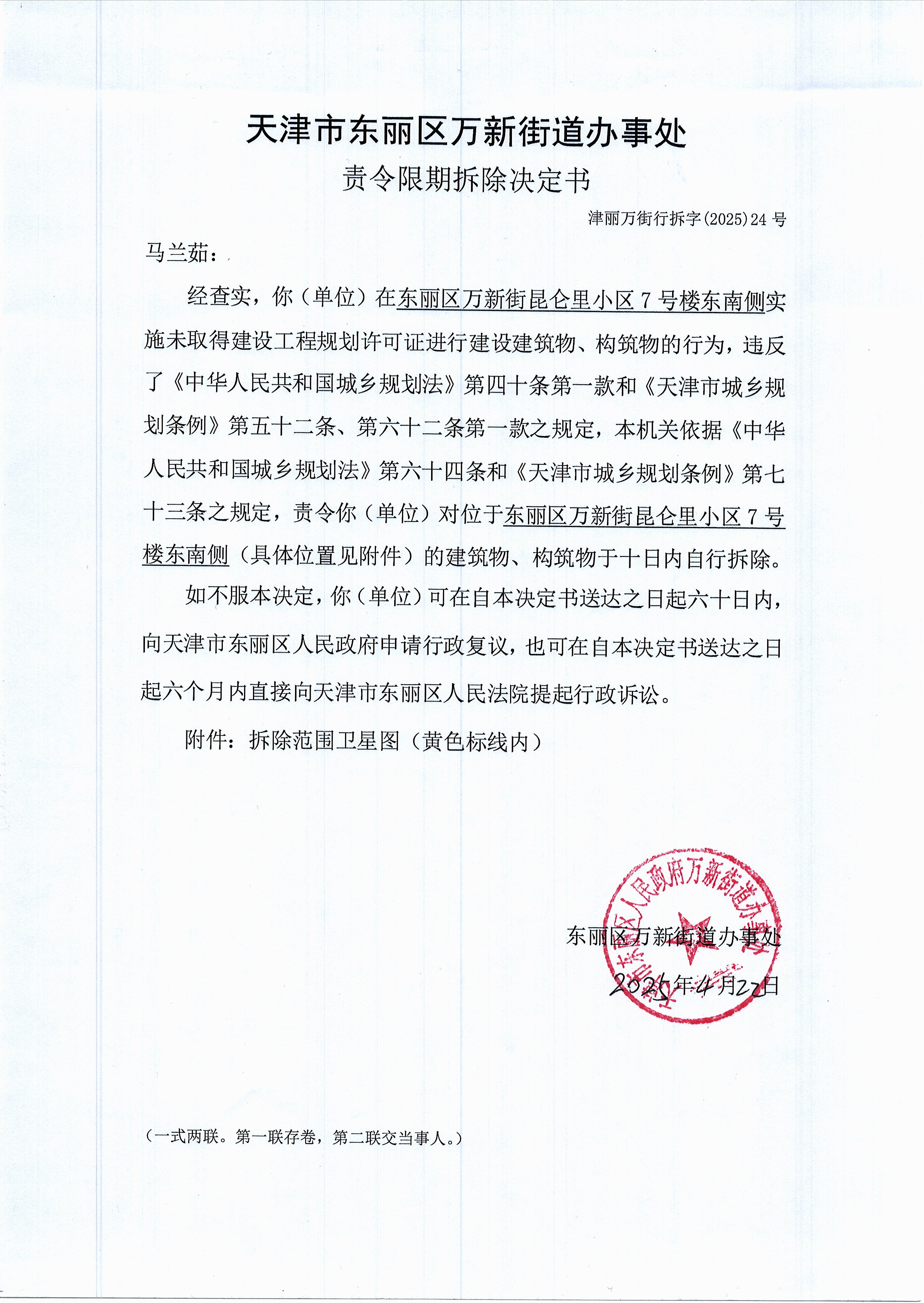 经查,你(单位)在USDT博彩平台 万新街昆仑里小区7号楼东南侧未取得建设工程规划许可证进行建设,其行为违反了《中华人民共和国城乡规划法》第四十条第一款和《天津市城乡规划条例》第五十二条、第六十二条第一款之规定,本机关依据《中华人民共和国城乡规划法》第六十四条和《天津市城乡规划条例》第七十三条之规定,于 2025年4月22日向你(单位)下达《责令限期拆除决定书》(文号:津丽万街行拆字【2025】24号),责令你(单位)限期拆除上述违法建设。