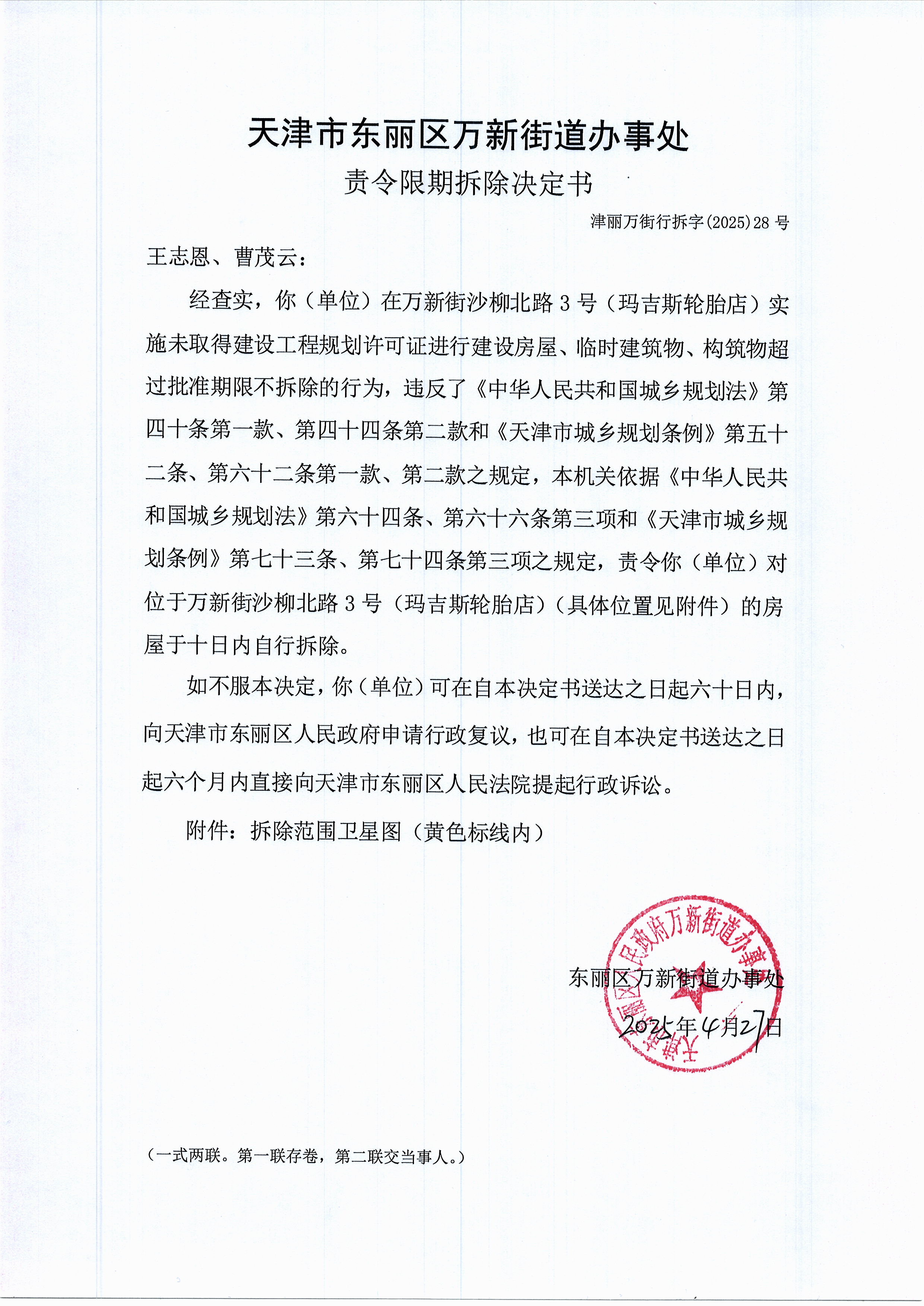 经查,你(单位)在沙柳北路3号(玛吉斯轮胎店)未取得建设工程规划许可证进行建设。其行为违反了《中华人民共和国城乡规划法》第四十条第一款、第四十四条第二款和《天津市城乡规划条例》第五十二条、第六十二条第一款、第二款之规定,本机关依据《中华人民共和国城乡规划法》第六十四条、第六十六条第三项和《天津市城乡规划条例》第七十三条、第七十四条第三项之规定,于2025年4月27日向你(单位)下达《责令限期拆除决定书》(文号:津丽万街行拆字(2025)28号),责令你(单位)限期拆除上述违法建设。