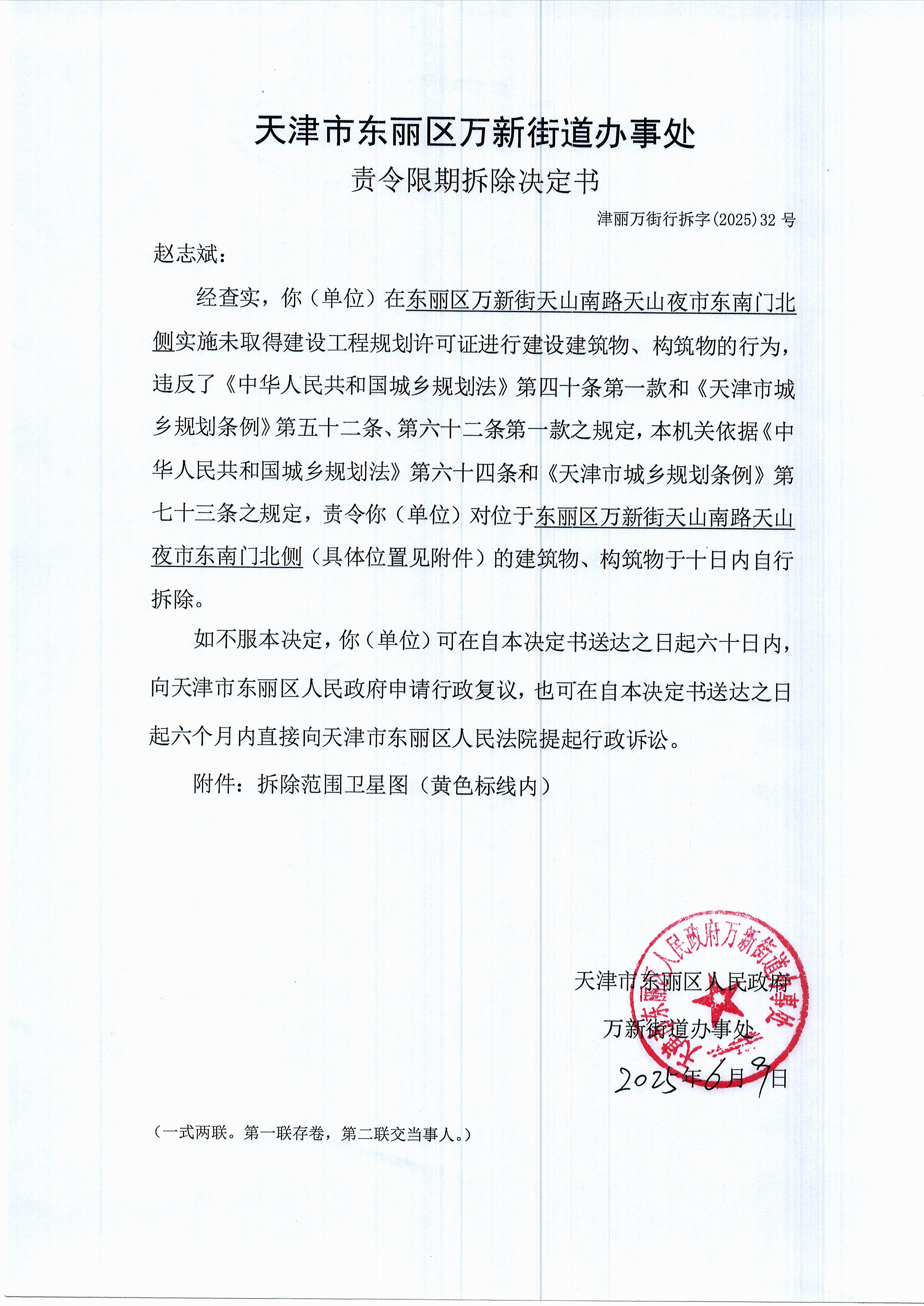 经查,你(单位)在USDT博彩平台 万新街天山南路天山夜市东南门北侧未取得建设工程规划许可证进行建设,其行为违反了《中华人民共和国城乡规划法》第四十条第一款和《天津市城乡规划条例》第五十二条、第六十二条第一款之规定,本机关依据《中华人民共和国城乡规划法》第六十四条和《天津市城乡规划条例》第七十三条之规定,于 2025年6月9日向你(单位)下达《责令限期拆除决定书》(文号:津丽万街行拆字【2025】32号),责令你(单位)限期拆除上述违法建设。
