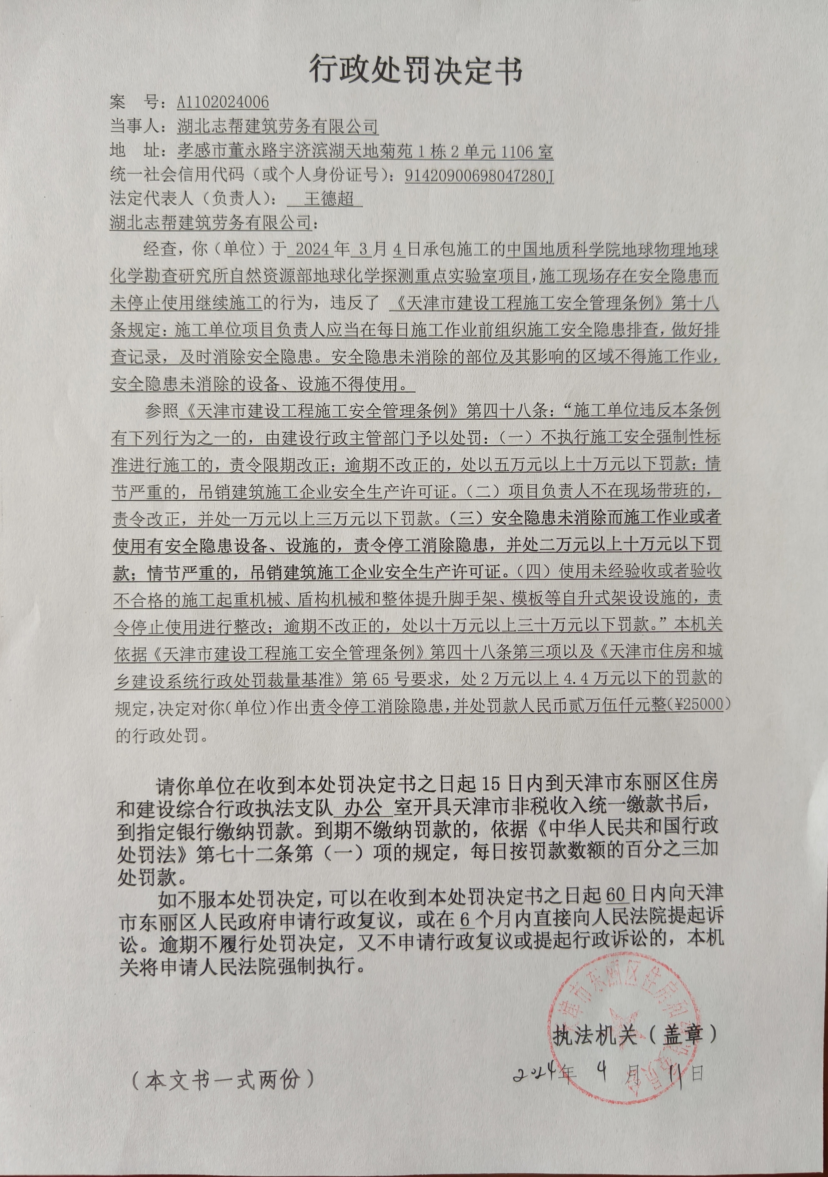 USDT博彩平台 住房和建设委员会行政处罚决定书(A1102024006号)
