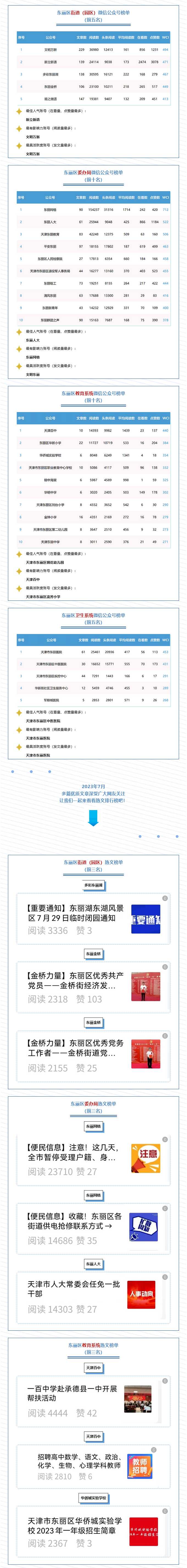 其中“文明万新”阅读量最高,头条阅读数第一,表现突出;“东丽网格”阅读量、平均阅读量、WCI最高,表现亮眼;“天津百中”WCI最高,值得赞扬;“天津市东丽医院”文章数、阅读量高居榜首!